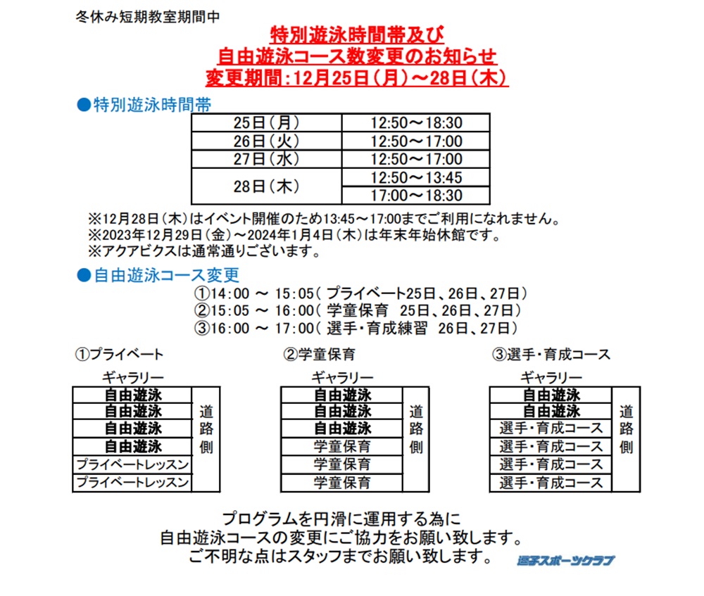 2023年年末年始コース変更のお知らせ