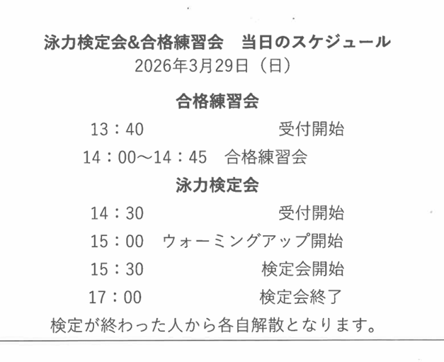 又、泳力検定会に向けての合格練習会も同日実施致します。スタート、ターン、泳ぎで不安に思っている方はご参加ください。
