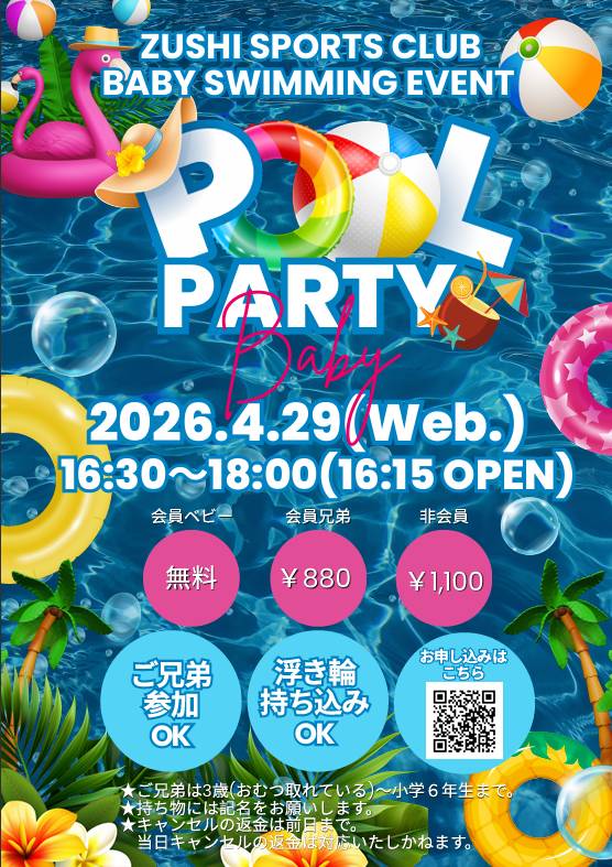 対象:生後6ヶ月〜3歳半までの赤ちゃんと保護者(保護者2名・ご兄弟も一緒にプールに入れます)